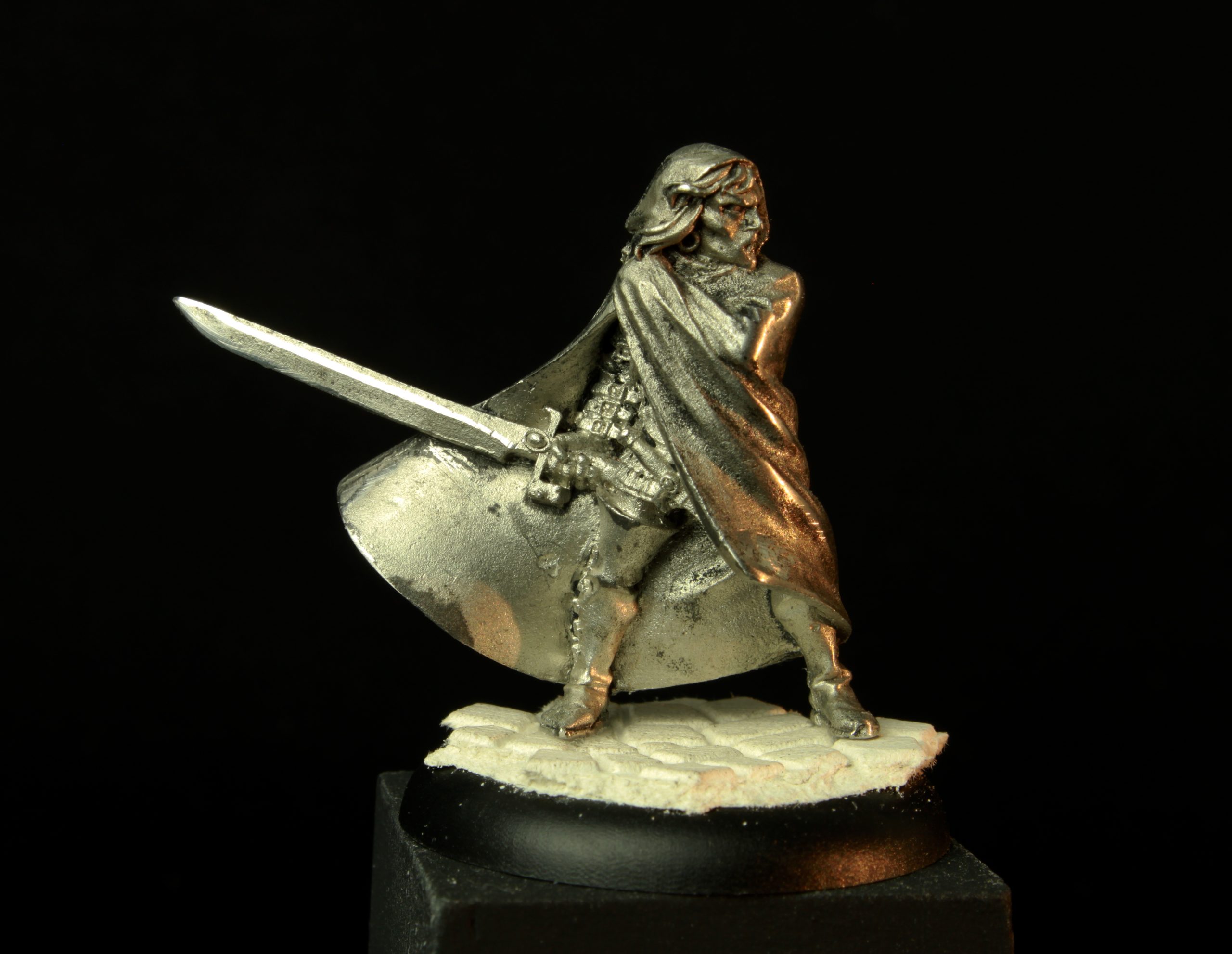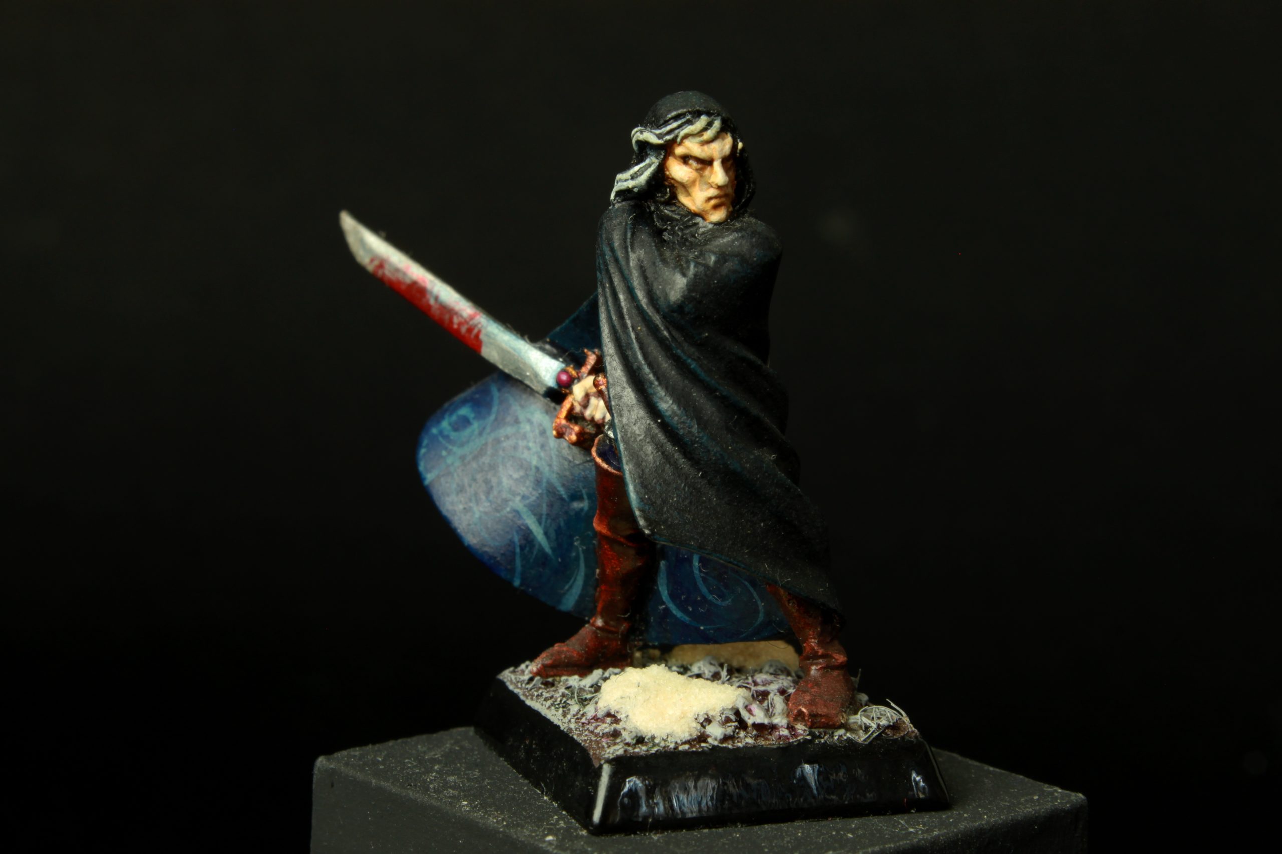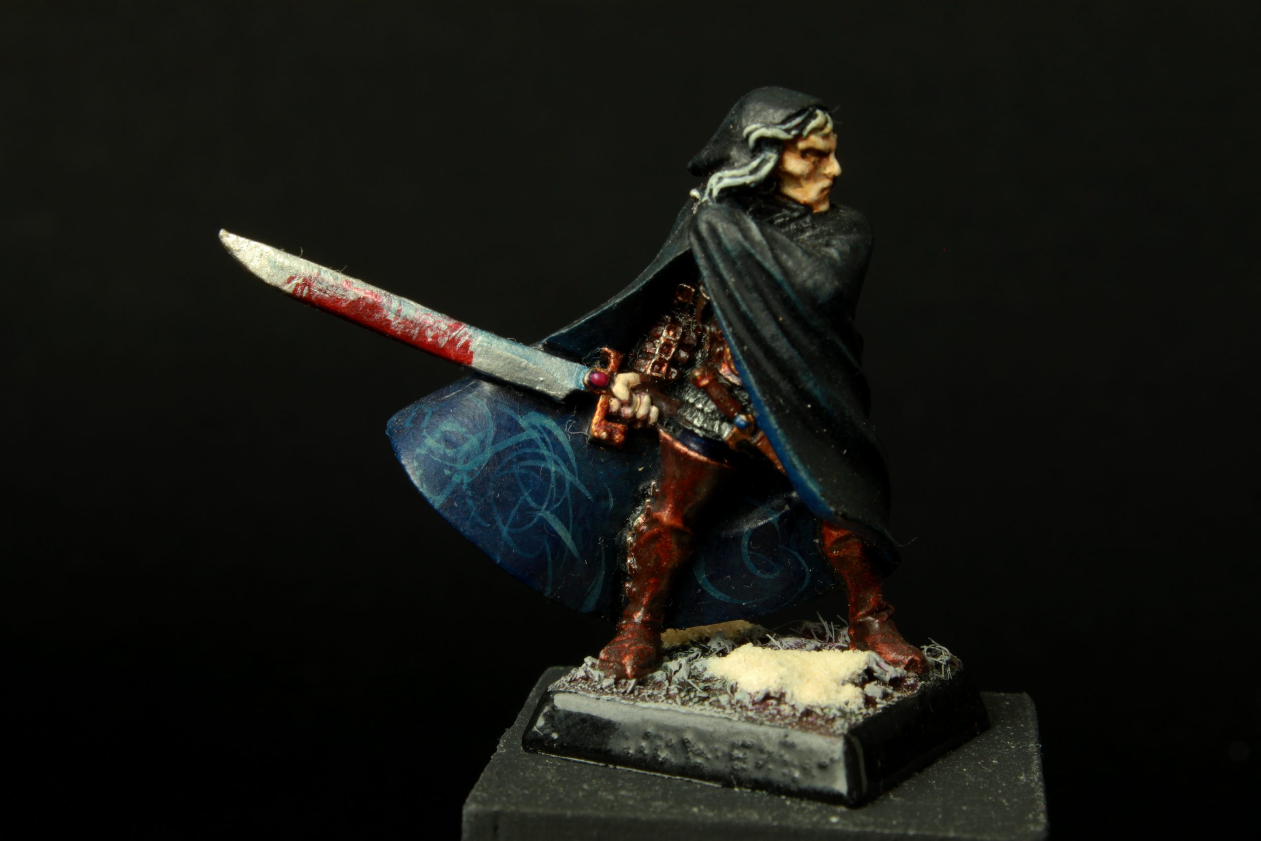 Cette fois-ci, sa lame est traitée en NMM, avec des reflets mystérieux dus à l’énergie magique de l’épée. J’ai choisis de lui faire une visage livide, voire maladif, avec des cheveux blonds, le tout bien à l’opposé de ce que j’avais peint à l’époque !