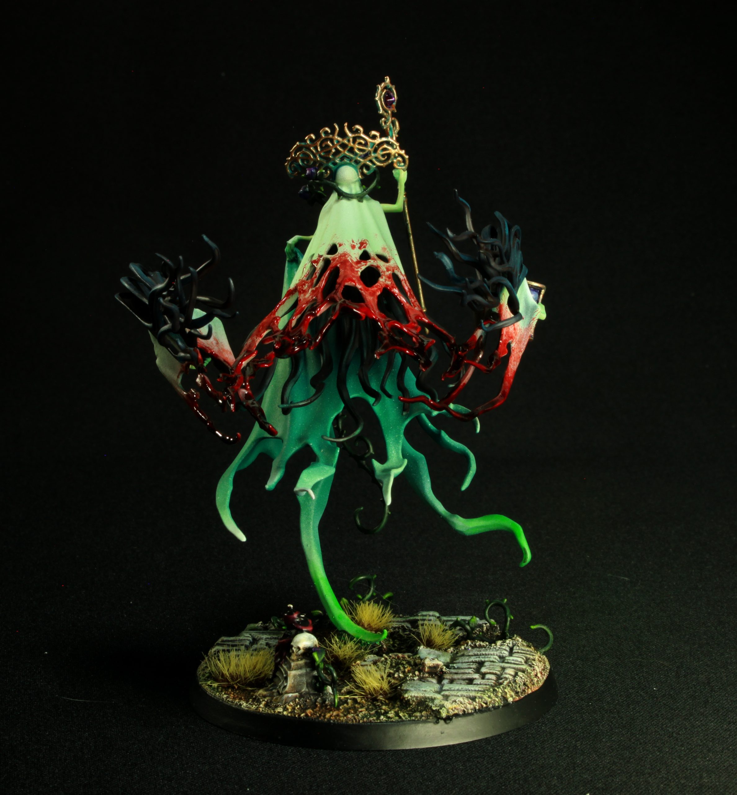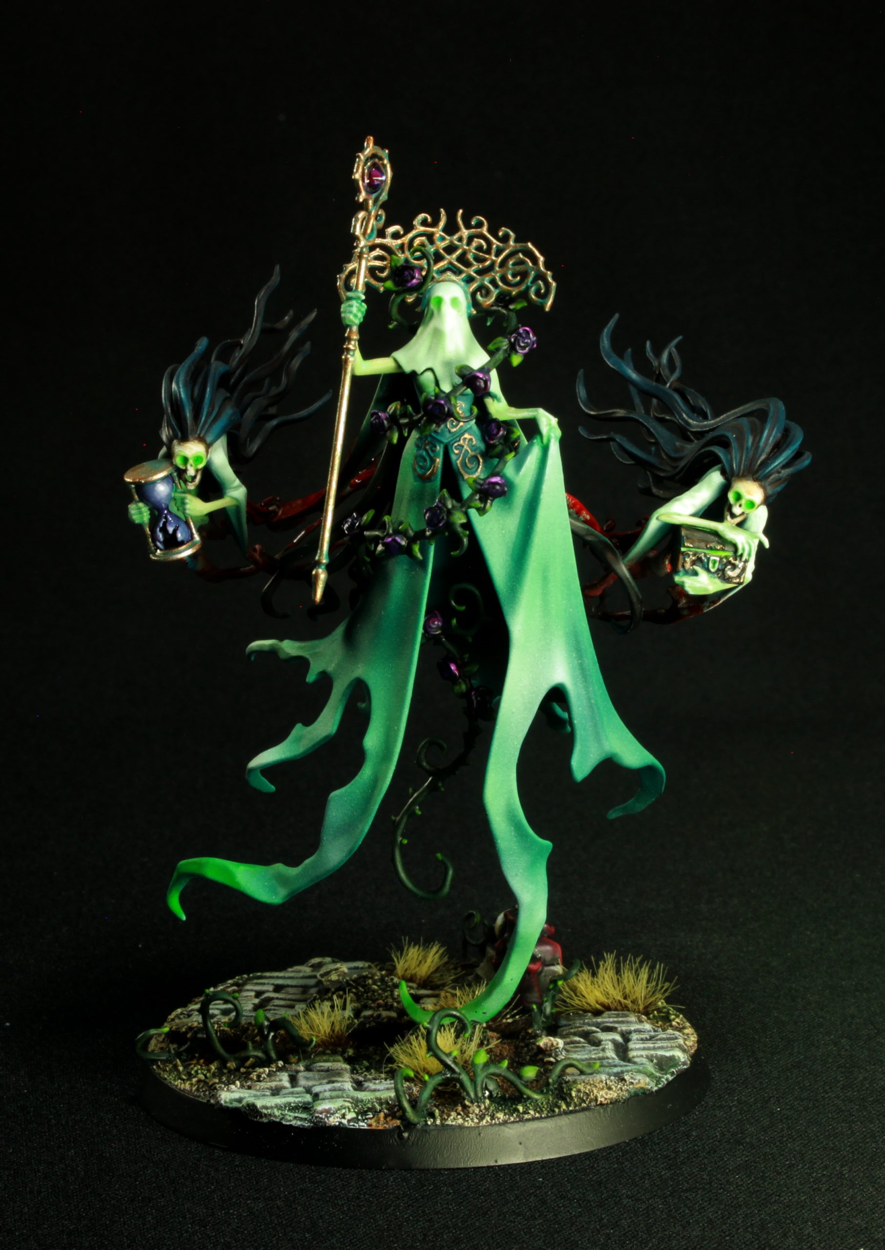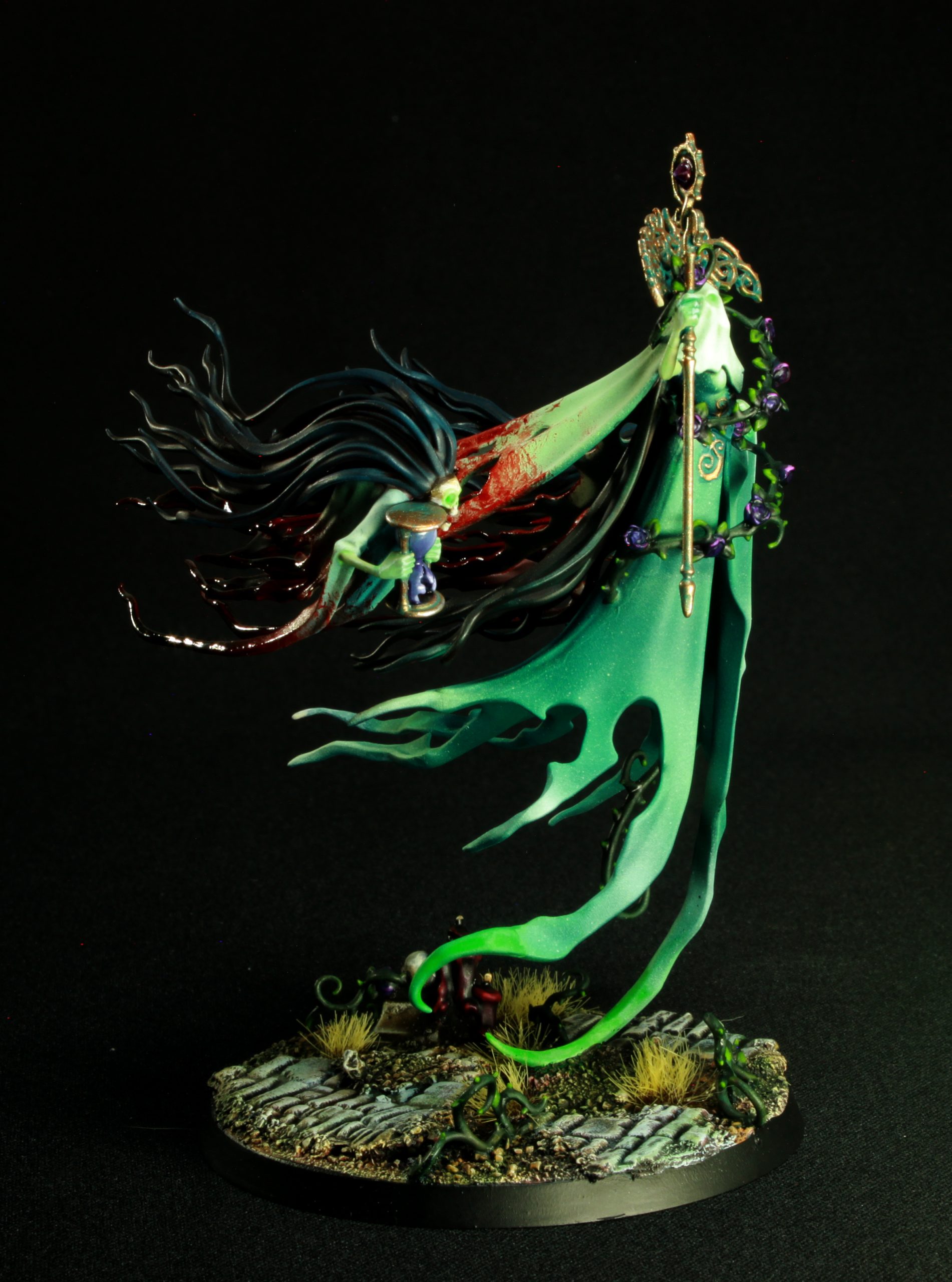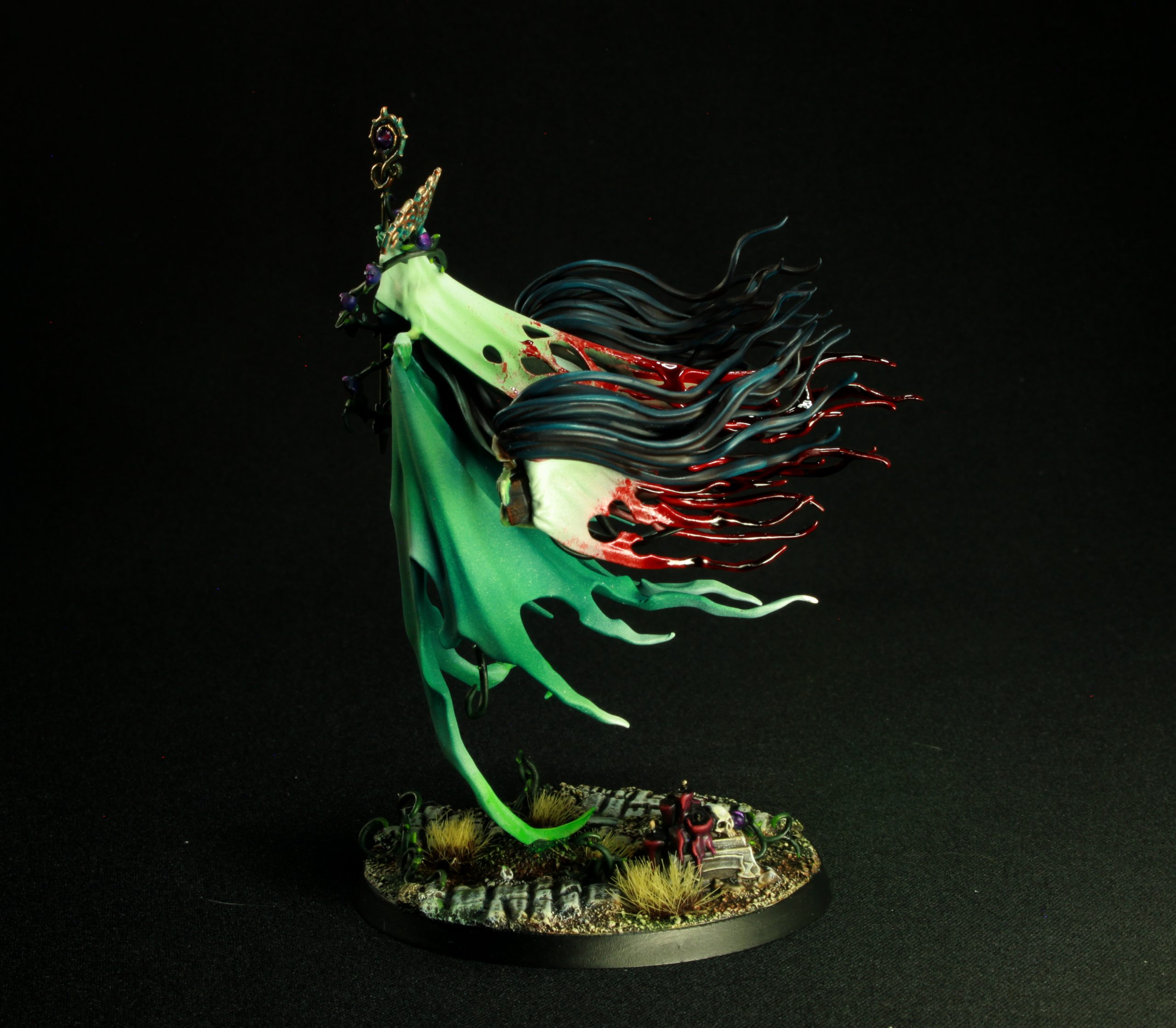 Accompagnée de ses deux servantes Banshees, j’ai choisi de lui appliquer une conséquente dose de sanguinolent ! Comme si son voile avait trempé dans une flaque de sang frais. C’est une technique que j’ai repris sur de nombreuses Banshees de cette armé, le rouge vif et sombre contraste à merveille avec les teintes turquoises, blanches et verdâtres des ectoplasmes